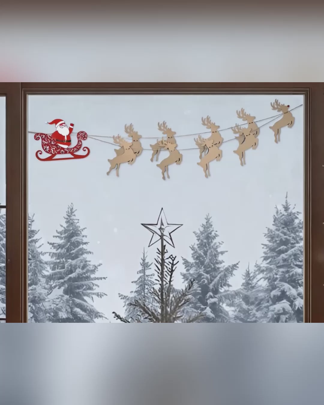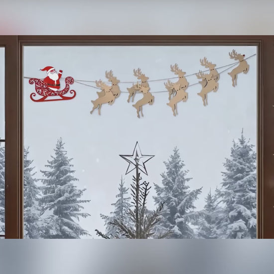 Bring the magic of Christmas to your home with The Santa Sleigh and Reindeer Garland. This festive garland features a bright red Santa in his sleigh carried by nine flying reindeer—Rudolph included, of course! The spacing of each piece is adjustable so you can customize the length and arrangement to fit your space perfectly. Hang it above a Christmas village, in a window, or along a mantle to add a whimsical touch of holiday cheer.